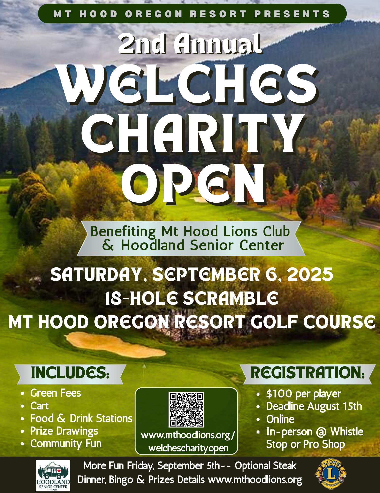 Join us on Saturday, September 6, 2025 for the 2nd Annual Welches Charity Open, proudly presented by Mt. Hood Oregon Resort. This community golf tournament brings together friends, neighbors, and local businesses to raise funds for two vital organizations: the Mt. Hood Lions Club and the Hoodland Senior Center.